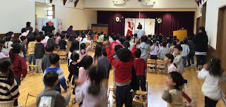 縄跳びを使っての前跳びや後ろ跳び、二重跳び、マットでの前転、後転、跳び箱を跳ぶなど体を使ってのパフォーマンスを見せてくれたサンタさん。技が決まるたび「うわーすごーい」と拍手する子どもたちでした。サンタクロースを信じ、喜び、飛び上がる子どもの姿。大切に守りたいなと思います。